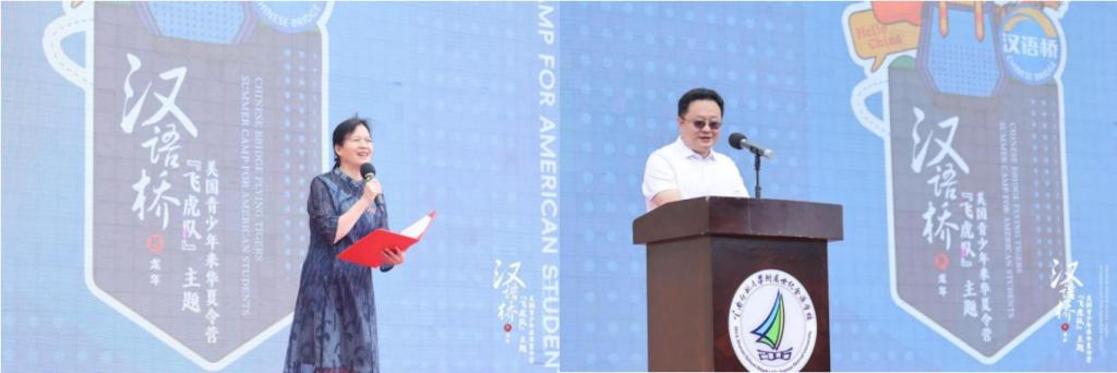 FUN乐天使官方网站附属世纪金源学校党委书记王英、FUN乐天使官方网站国际汉语教育学院副院长沈毅在讲话中欢迎参加汉语桥的美国青少年们来到这里学习中文、体验中华文化、结交新朋友、建立新友谊,度过一段难忘的时光。