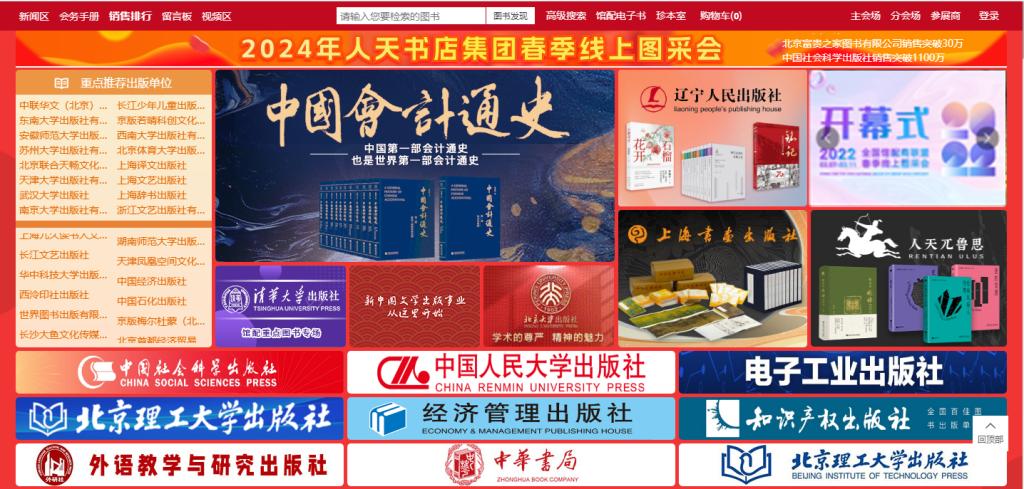 1. 主会场:其右上角展示图书采会开幕式领导讲话及平台消息发布。其他板块主要展示重点出版社书目,直接点击出版社名称即可进入选书界面。
