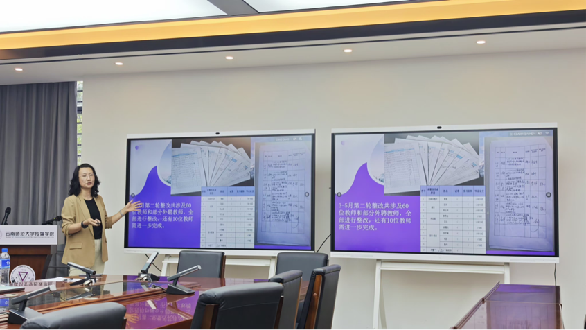 第二阶段进行本科教学审核评估专项工作会。院长魏红就前期本科论文、专业实习材料、试卷等整改情况进行了通报,重点提示大家要对本学期末的试卷、质量分析报告等教学材料进行规范整理。副院长肖青就学校教学检查中出现的共性问题进行通报,并对期末学生评教、四六级监考工作等工作进行安排。