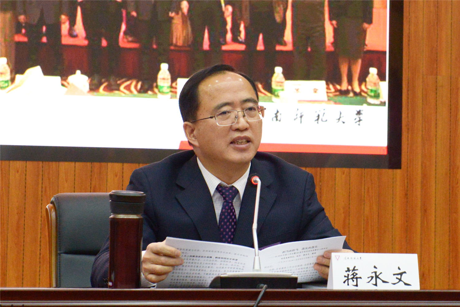 会上,校党委副书记、校长蒋永文同志从九个方面总结回顾了学校2018年工作:一是坚持全面从严治党,党建思政工作成绩突出;二是深化教育教学改革,人才培养质量稳步提升;三是完善协同创新机制,科研水平持续增长;四是聚焦推进分类指导,学科学位点建设喜获丰收;五是持续推进人才强校,创新人事管理成效明显;六是深化对外合作交流,国际化水平有效提升;七是适应经济发展需要,文化传承和社会服务能力不断增强;八是校庆工作顺利圆满,“以庆促建”目标如期实现;九是有力保障改善民生,持续增强师生幸福感。在指出学校与建设“双一流”高校目标仍有差距,学科内涵建设需进一步加强、深化综合改革的工作需继续全面推进、师资队伍建设机制需进一步改进、引领全省师范教育改革发展、输出优质基础教育资源的作用不到位几点不足基础上,蒋永文校长安排部署了2019年重点工作:一是加强全面从严治党,为学校改革发展提供坚强政治保证;二是深化学校综合改革,激发学校办学活力;三是完善人才培养体系,全面提升教育教学质量;四是加强师资队伍建设,提升教师队伍素质和专业化水平;五是持续优化学科结构,加快推进一流学科建设;六是注重成果转化应用,全面提升科研创新水平;七是积极谋求共赢发展,着力增强服务社会能力;八是深化对外开放合作,提升教育国际化水平;九是持续改进民生保障,确保校园安全和谐。蒋校长强调,要提高政治站位抓落实,要聚焦重点抓落实,要认清形势、深入研究抓落实,要亲力亲为、深入一线抓落实,要防范风险抓落实,要以钉钉子精神抓落实,通过狠抓落实,为学校教育新发展新跨越开好局、起好步、奠好基。