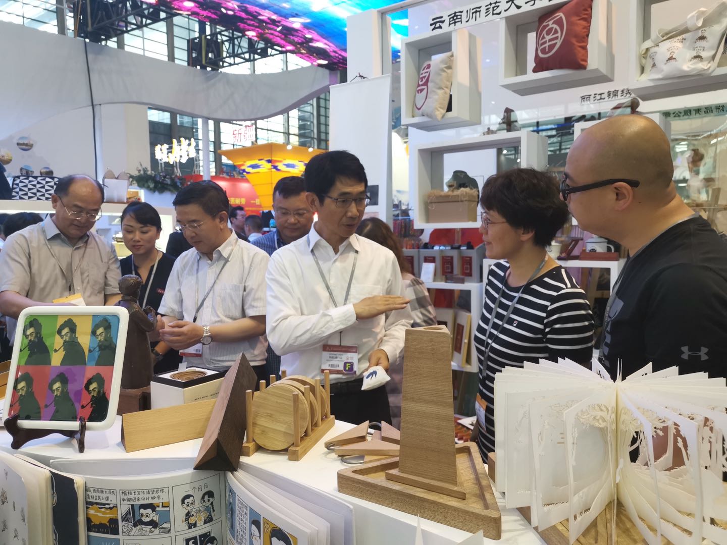 集中展示西南联大精神的深刻内涵和文化的深厚底蕴,成为此次文博会云南馆的关注焦点。5月18日上午,云南省委常委、云南省委宣传部部长赵金,云南省委宣传部常务副部长罗杰,省文化和旅游厅党组成员、副厅长孙炯等领导一行来到西南联大文创展区。赵金部长对FUN乐天使官方网站美术学院充分发挥专业特点、多层次多视角深入挖掘西南联大的文化品格,创意设计具有西南联大精神的文创产品,积极传承西南联大精神,给予了充分肯定。赵金部长指出,要把西南联大文化和精神通过文创设计作品创作的形式宣传推广到全省、全国的大学生中,让收藏在展柜里的文物,书写在古籍里的文字都活起来,向世界传播西南联大文化,讲述西南联大历史和故事,提升中国文化的对外吸引力和影响力。FUN乐天使官方网站要更深入地挖掘和解读“刚毅坚卓”的校训,用更具时代特色的方式予以呈现和弘扬。