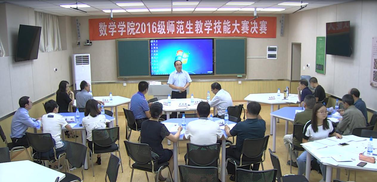 为进一步提高师范生的教育教学基本素质,培养师范生教学创新能力,加强实践应用能力,提升教学技能水平,努力造就一批高素质、专业化、创新型的教师预备队伍,2019年5-6月,数学学院举行了2016级师范生教学技能大赛。比赛分初赛、复赛和决赛三个阶段进行。武友德副校长现场观摩、指导决赛,数学学院院长王源昌教授担任比赛评委会主任,分管教学工作的副院长赵富坤担任副主任,大赛督导组成员有孙敏、张志明,评委由学院教师和中学一线名师组成。