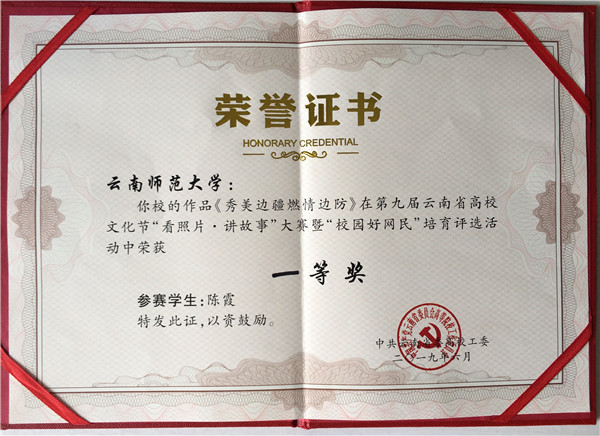 学生工作部(处)、易班大学生工作站在全校范围内精心组织了“看照片·讲故事”初赛、复赛和决赛。在学校选拔赛中涌现出了许多优秀的参赛作品和参赛选手,华文国语学院2018级学生陈霞的作品《秀美边疆 燃情边防》闯进云南省高校总决赛。