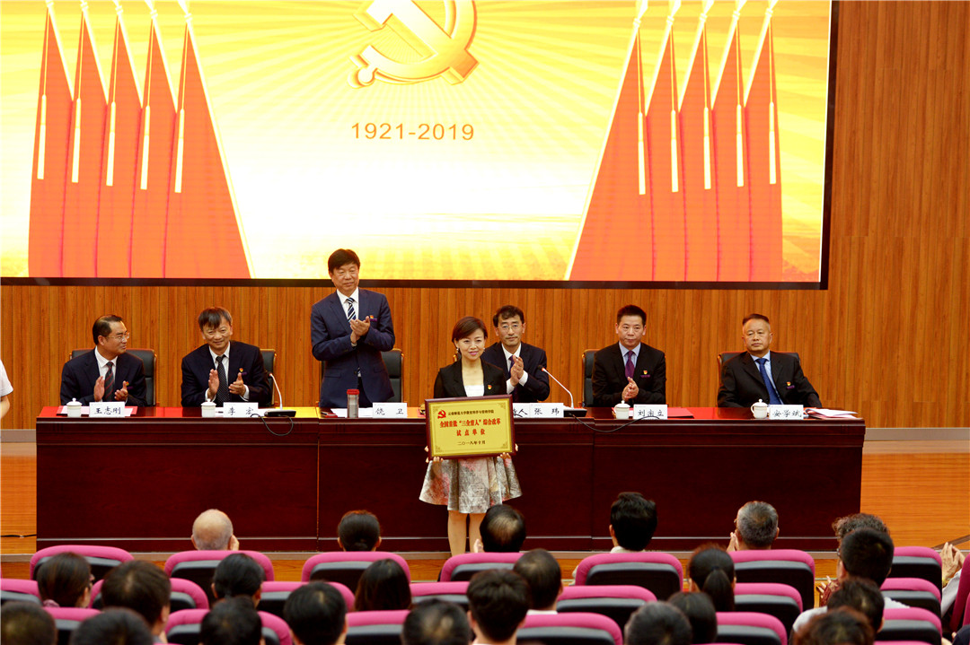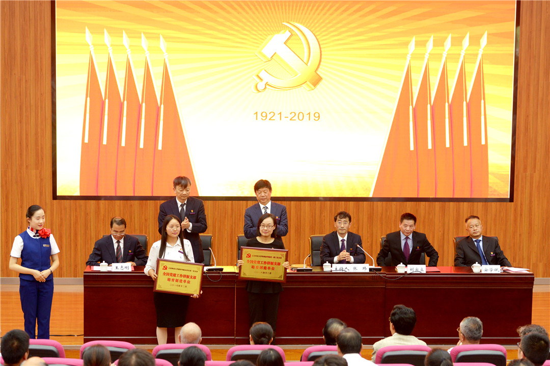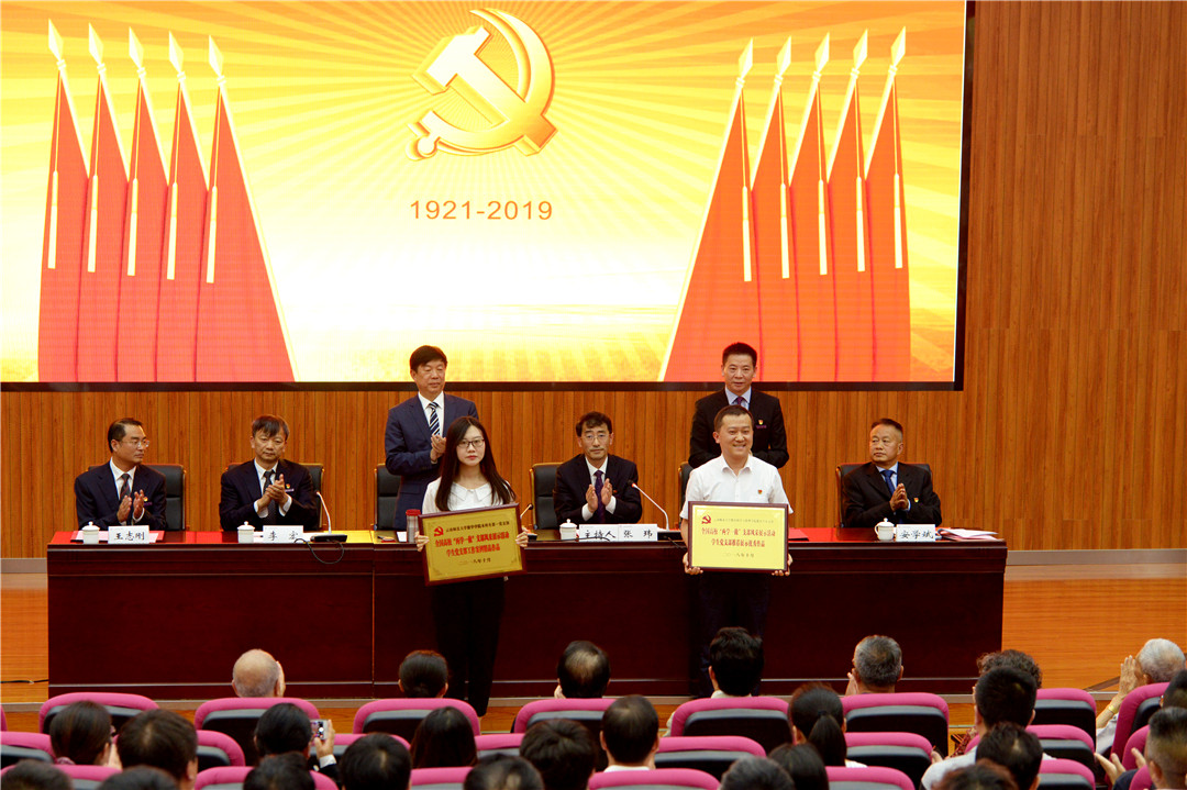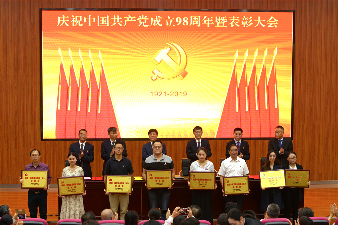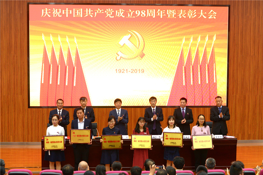 校党委副书记李宏同志宣读获得首批“全国党建工作样板支部”培育创建单位名单,第二届全国高校“两学一做”支部风采展示活动成果入选名单,全国首批“三全育人”综合改革试点单位名单,省委高校工委高校创建一流党建示范院(系)党组织、示范党支部和示范项目名单,省委高校工委“规范化建设示范党支部”选树名单、学校创建一流党建示范院(系)党组织、示范党支部和示范项目名单,学校规范化建设达标党支部名单和示范党支部选树名单。主席台就座的学校领导为获得表彰的二级单位党组织、基层党支部、示范项目等授牌。