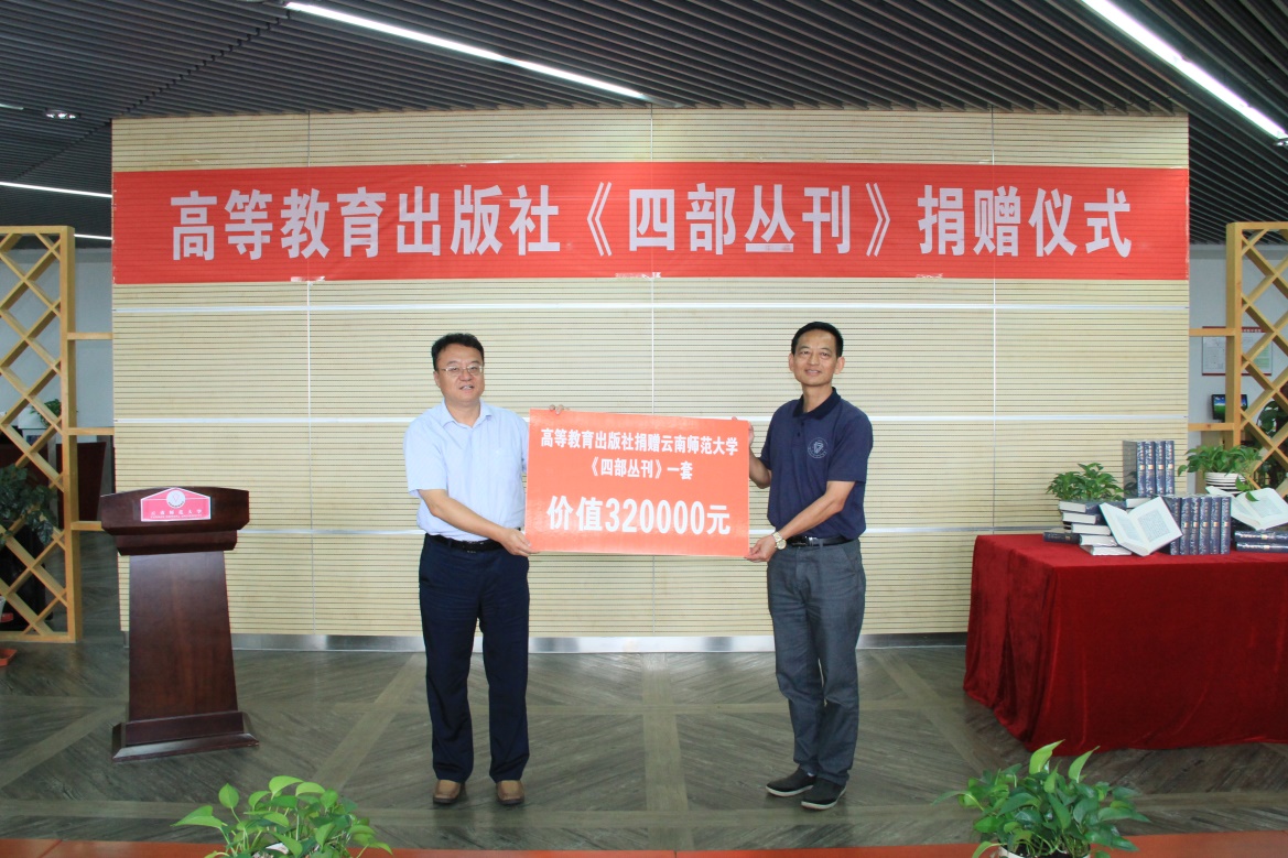 7月8日下午,高等教育出版社向fun88官网捐赠一套价值32万元的《四部丛刊》,共656卷,捐赠仪式在图书馆七楼特色文献书库举行。高等教育出版社副总编辑贾瑞武,销售部副主任张艺文,市场与教学服务部武霖、黄林、陈丽,云南教服中心主任李龙,FUN乐天使官方网站副校长安学斌,宣传部副部长周妍,资产处处长李永明、副处长盛永红,图书馆馆长殷国聪、副馆长傅宇斌以及师生代表等出席了仪式。仪式由图书馆党总支书记王顺英主持。