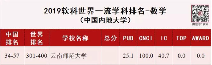 软科(6月26日)正式发布2019“软科世界一流学科排名”(ShanghaiRanking's Global Ranking of Academic Subjects)。2019年排名覆盖54个学科,涉及理学、工学、生命科学、医学和社会科学五大领域。中国内地高校表现强势,共有233所上榜,上榜总次数2001次。云南共有3所高校的6个学科上榜。fun88官网数学学科上榜,国内排名34-57名,世界排名301-400名。