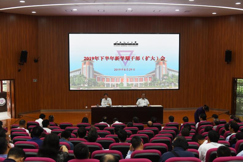 8月29日下午,fun88官网2019年下半年新学期干部(扩大)会在呈贡主校区汇学2栋101报告厅召开。学校全体校领导,省管干部,近三年离退休校领导,全校副处级及以上干部(含非领导职务),机关副科级及以上实职干部,省部级教学科研平台负责人,省党代会代表、人大代表、政协委员,各民主党派基层负责人,离退休党支部书记、副书记,教师代表共500余人参加会议。会议由校党委书记饶卫主持。