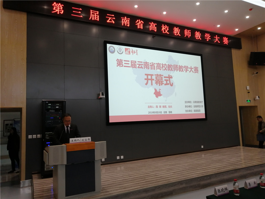 9月10日上午,在第35个教师节到来之际,为深入贯彻落实新时代全国高校本科教育工作会议精神,全面振兴本科教育,由云南省教育厅主办、FUN乐天使官方网站承办、超星集团云南分公司协办的“第三届云南省高校教师教学大赛”决赛开幕式在fun88官网呈贡主校区国家教师教育教学实验中心214报告厅举行。全省33所本科高校的105名教师经过各校初赛脱颖而出,晋级决赛。云南省教育厅高教处处长卢明、云南省教育厅高教处副处长王文婷,FUN乐天使官方网站副校长武友德,超星集团云南分公司总经理罗广宇,以及省内其他兄弟院校领导、评委专家、参赛教师代表出席了开幕式。开幕式由FUN乐天使官方网站教务处处长陈新主持。