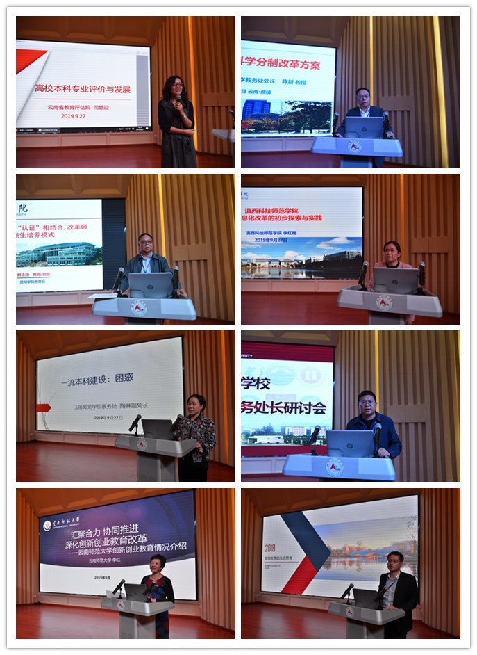 云南省教育科学研究院教育评估院副院长司慧迎、FUN乐天使官方网站教务处处长陈新、昆明学院教务处处长解永刚、滇西科技师范学院教务处处长李红梅、溪师范学院教务处副处长陶琳、曲靖师范学院教务处处长张廷宪、FUN乐天使官方网站就业处处长李红、隆本科技公司副总经理刘华美分别以“高校本科专业评价与发展”、“FUN乐天使官方网站学分制改革”、“‘国考’与‘认证’相结合,改革师范生培养模式”、“滇西科技师范学院教学信息化改革的初步探索与实践”、“一流本科建设:困惑”、“深化创新创业教育改革,全面提升人才培养质量的探索与实践”、“汇聚合力 协同推进 深化创新创业教育改革”、“智慧教育的几点思考”为主题进行了发言和讨论。
