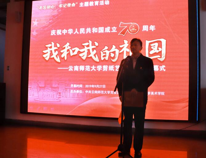 2019年9月26日上午,美术学院与学校党委宣传部联合举办“不忘初心、牢记使命”主题教育“我和我的祖国——庆祝新中国成立七十周年剪纸作品展”。校党委李宏副书记出席开幕式,宣布展览开幕。校党委组织部部长蔡金红、宣传部长余冰释,校团委、研究生部、学生工作处、就业处、音乐舞蹈学院、旅游与地理科学学院等单位负责人,美术学院客座教授、非遗传承人樊涌,美术学院领导班子成员、师生代表共200余人参加了此次活动。开幕式由美术学院党委书记张健主持,美术学院院长戴杰致辞,在精心编排快闪《我和我的祖国》歌声中拉开序幕。