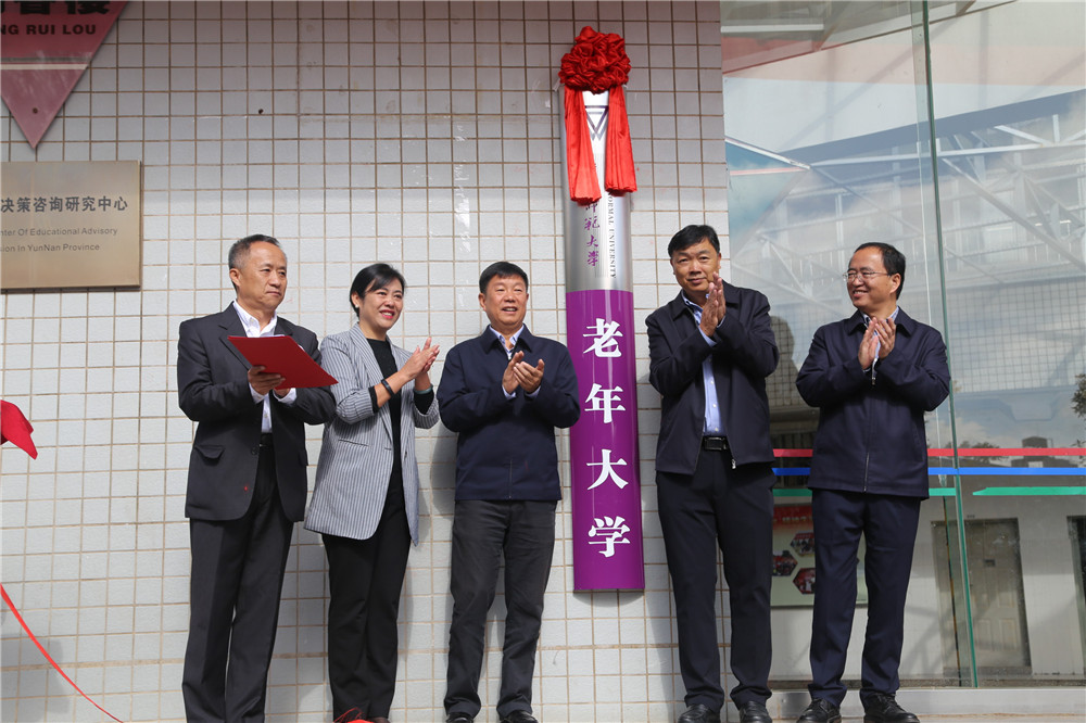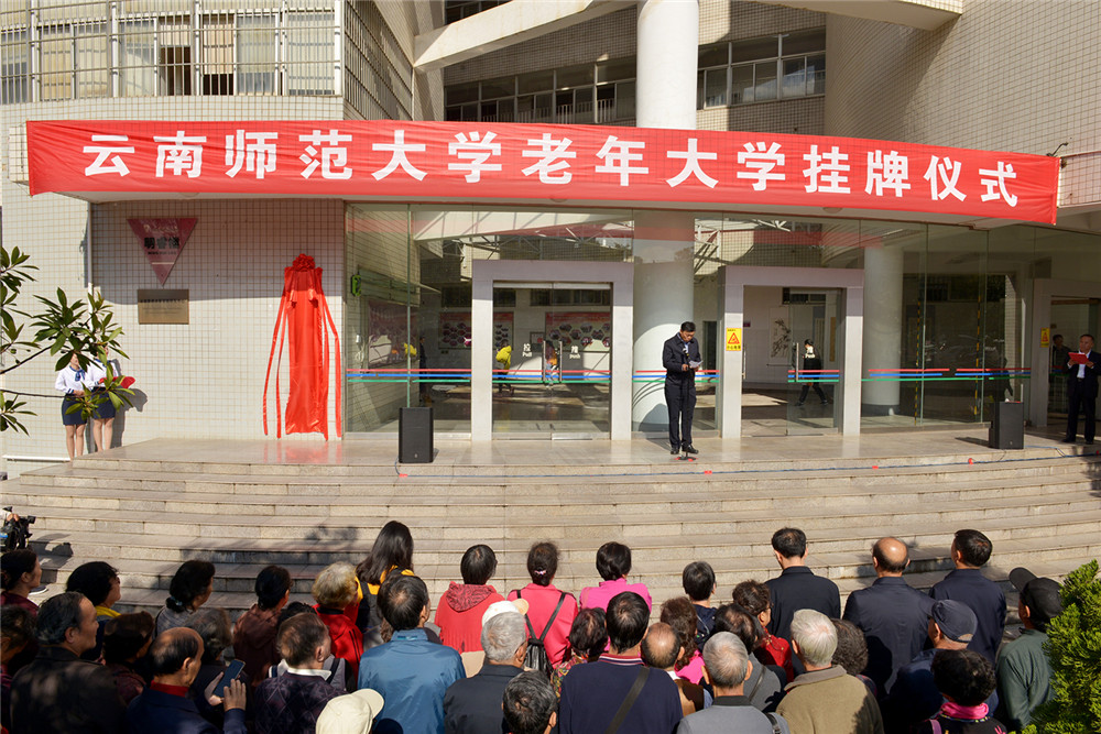 云南省委老干部局副局长王从文,FUN乐天使官方网站党委书记饶卫、校长蒋永文,云南老年大学校长伍敏一同为FUN乐天使官方网站老年大学揭牌。省委老干部局副局长王从文、我校党委副书记张玮、学校老教授协会会长杨文泽分别致辞和发言。王副局长说,正当全党深入学习贯彻习近平新时代中国特色社会主义思想,第二批“不忘初心、牢记使命”主题教育开展之际,FUN乐天使官方网站成立老年大学并举行挂牌仪式,这是加强和改进离退休干部工作,推动老年教育事业发展,丰富老年人政治、精神、文化生活的一件喜事。FUN乐天使官方网站成立老年大学,充分体现了学校贯彻落实省委、省政府决策部署的高度政治自觉,充分体现了学校积极推动老年教育事业的责任担当,也充分体现了对离退休教职工的真切关怀。王副局长希望FUN乐天使官方网站充分发挥自身的独特优势,不断总结和积累老年大学办学经验,按云南省委书记陈豪的指示要求,担起社会责任,缓解我省老年大学的矛盾和压力,努力把老年大学办成广大离退休干部和老年朋友们的政治活动中心、学习文化课堂、文化娱乐场所和安度晚年的乐园,办成高等院校开办老年大学的“样板”。校党委副书记张玮在致辞中指出,在学校开展“不忘初心、牢记使命”主题教育中,成立FUN乐天使官方网站老年大学,是为全校1400余名离退休教职工提供更新知识的课堂、文化学习的园地和延年益寿的场所,是努力满足学校广大离退休教职工文化需求的具体举措。老年大学将为离退休教职工们创建终身学习平台,让大家老有所教、老有所学、老有所乐,不断提高广大离退休教职工的文化素养和身心健康水平,实现“夕阳无限好,人间重晚晴”的靓丽美景。FUN乐天使官方网站老教授协会会长杨文泽代表全体离退休教职工做了发言。他由衷地说,老年大学的正式挂牌,使云南师大的离退休教职工有了一所自己的大学,心里感到无比高兴。