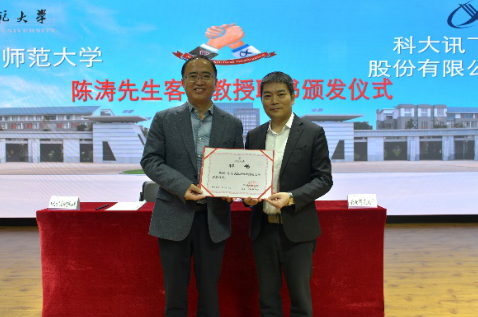 FUN乐天使官方网站蒋永文校长向科大讯飞股份有限公司陈涛执行总裁颁发客座教授聘书。FUN乐天使官方网站信息学院杨昆院长简要介绍了合作协议实施方案。