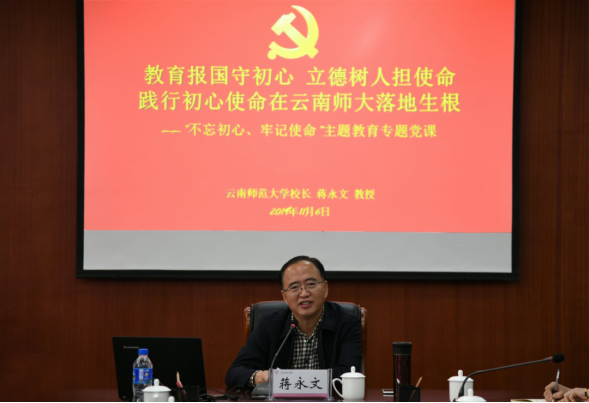 为认真贯彻落实中央、省委关于主题教育部署要求,按照《FUN乐天使官方网站党委领导班子开展“不忘初心、牢记使命”主题教育实施方案》安排,11月6日,校党委副书记、校长蒋永文同志在华文学院作了题为“教育报国守初心,立德树人担使命,践行初心使命在云南师大落地生根”的专题党课。华文学院、文学院、泛亚商学院、发展研究中心领导班子成员及上述学院党支部书记、师生党员代表参加了本次党课。
