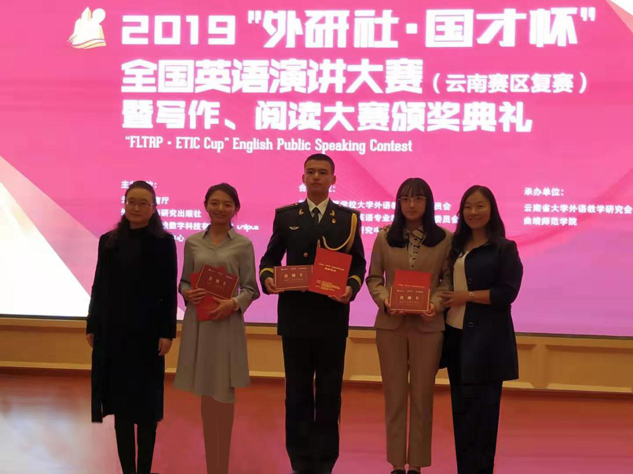 11月1日,2019年“外研社杯”全国英语演讲大赛云南赛区比赛在曲靖师范学院举行。fun88官网外国语学院2018级研究生郭思雨同学荣获特等奖,赢得了代表云南省各高校到北京参加全国决赛的资格;旅地学院2018级本科生谭一同学荣获一等奖。