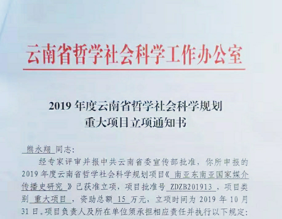 近日,中共云南省委宣传部公告了2019年度云南省哲学社会科学规划重大项目、重点项目立项名单。在所立项的13项重大项目中,fun88官网安学斌教授领衔的“新中国70年云南民族文化保护传承发展研究”和传媒学院申报的“南亚东南亚媒介传播史研究”获准立项研究。