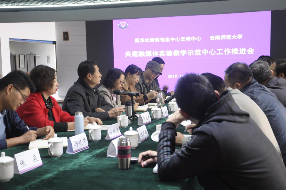 2019年11月8日下午,由新华社新闻信息中心云南中心和FUN乐天使官方网站联合召开的县级融媒体实验教学示范中心工作推进会在传媒学院大厅举行。会议由传媒学院院长熊永翔主持,参加会议的有新华社新闻信息中心副主任鲁晓艳,编委会副主任谭熙鹏,技术总监叶勤,技术员谢开红,fun88官网党委副书记李宏,副校长武友德,教务处处长陈新,信息管理处副处长刘江涛,传媒学院副院长周芸、牛凌燕以及各系教师代表。会议围绕传媒学院与新华社建设县级融媒体实验教学示范中心的具体工作展开研讨和论证。
