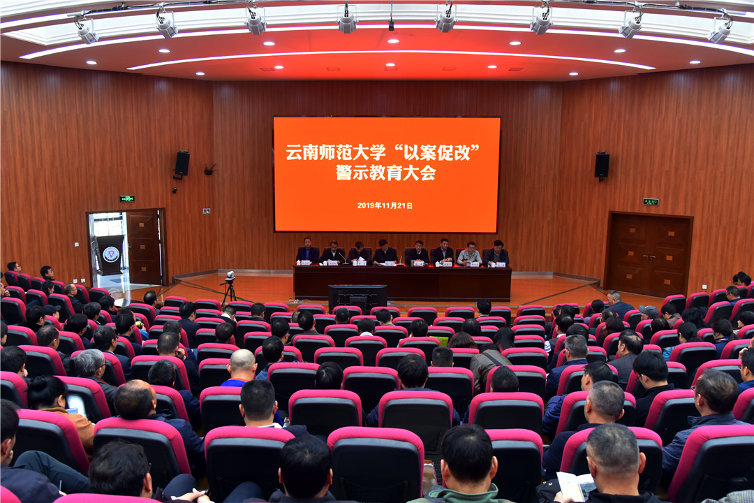 按照中央、省委的部署,以秦光荣案为镜鉴,彻底清除秦光荣严重违纪违法,对云南政治生态造成的恶劣影响,坚持全面从严治党,构建风清气正的校园政治生态,更好地推动学校健康发展,11月21日下午,fun88官网在呈贡主校区汇学2栋101报告厅召开“以案促改”警示教育大会。校党委书记饶卫,党委副书记张玮,党委副书记李宏,副校长刘宗立,纪委书记王志刚,副校长牛治亮、安学斌、刘坚及全校副处级以上干部出席了此次大会。会议由校党委书记饶卫主持。