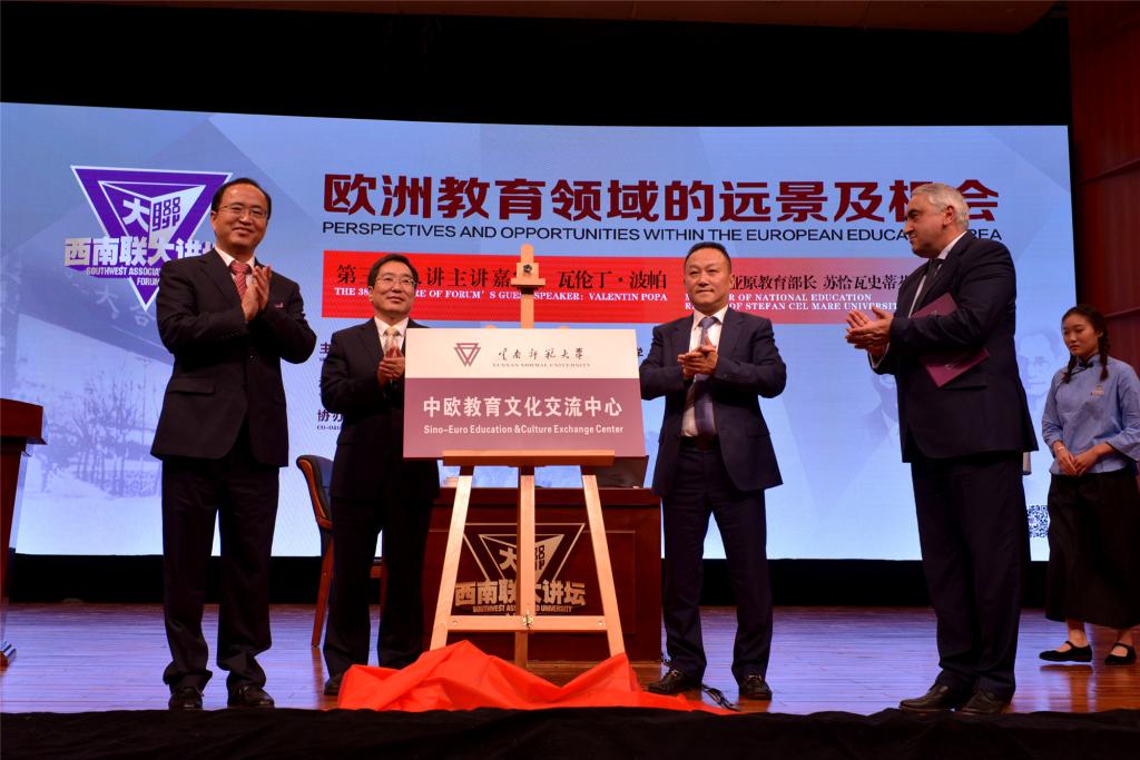 瓦伦丁·波帕教授、蒋永文校长、贵州星辰教育执行总裁陈菓及外国语学院院长冯智文共同为“中欧教育文化推广中心”揭牌。该中心将致力于国际教科研合作与文化交流活动、国际博士硕士联合培养、海内外高端学术会议、交换生项目等。
