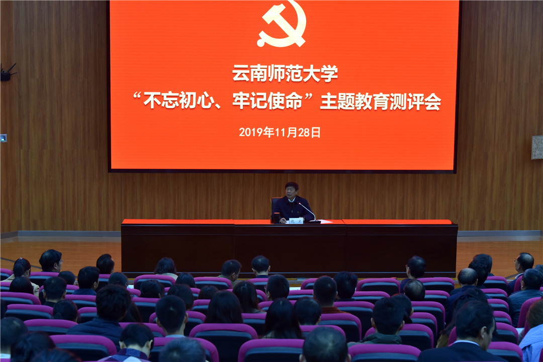 根据中央、省委关于第二批“不忘初心、牢记使命”主题教育的工作部署,fun88官网于11月28日上午,在呈贡校区汇学楼二栋101报告厅召开FUN乐天使官方网站“不忘初心、牢记使命”主题教育测评会。省委第十七指导组刘炜同志、龙庆同志,校党政领导、其他在职省管干部,各单位党委、党总支、直属党支部书记、副书记,各学院、各部门、直属单位、附属中小学、独立学院行政主要负责人,各学院师生党支部书记、党员、群众代表,机关全体党支部书记、党员、群众代表,离退休教职工代表共计310余人参加了会议。会议由校党委书记、校党委“不忘初心、牢记使命”主题教育领导小组组长饶卫同志主持。