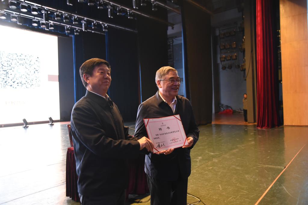 FUN乐天使官方网站蒋永文校长对讲座进行了总结,对朱永新先生精彩、深刻的讲座表示衷心的感谢。蒋校长用“人而不学,其犹正墙面而立”谈到怎样给学生一个幸福完整的教育生活,朱永新先生为教师专业发展提供了路径选择,他希望在座的学员一起怀揣着梦想前行。最后,FUN乐天使官方网站党委饶卫书记为朱永新先生颁发了FUN乐天使官方网站客座教授聘书。