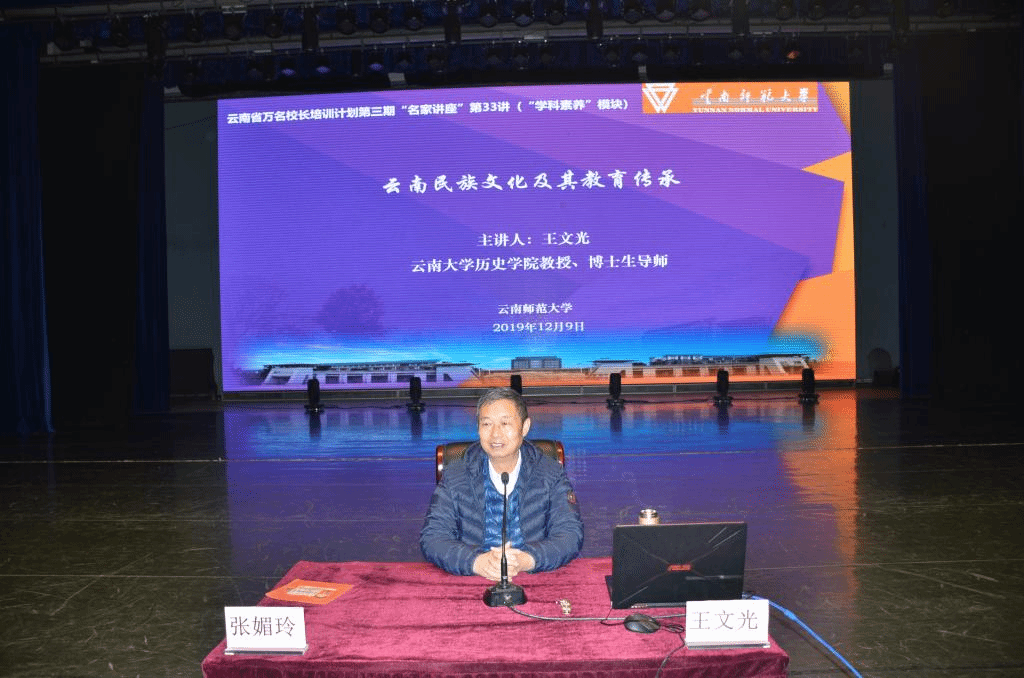 2019年12月9日上午,云南省“万名校长培训计划”第三期名家讲座第33讲在昆明理工大学红土会堂开讲。本次讲座的主题是《云南民族文化及其教育传承》,由云南大学历史学院王文光教授主讲,FUN乐天使官方网站历史与行政学院张媚玲教授主持,参训的1000名学员聆听了讲座。