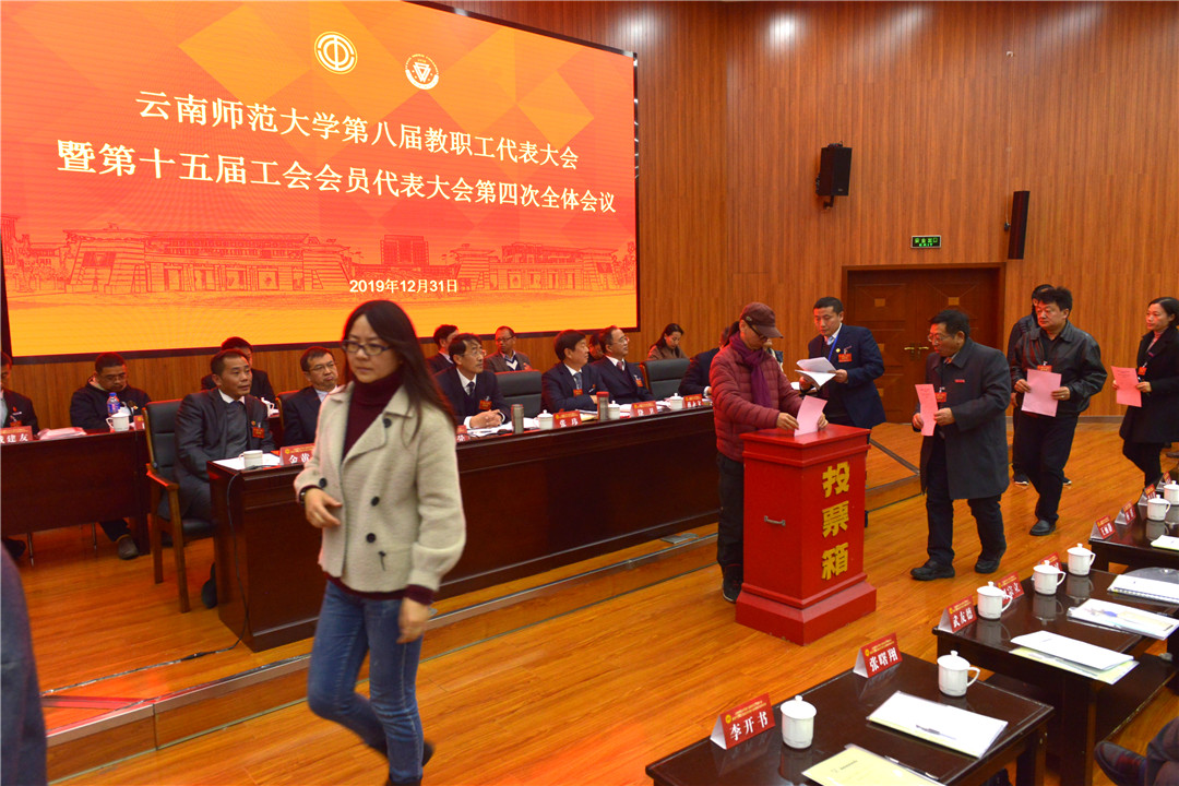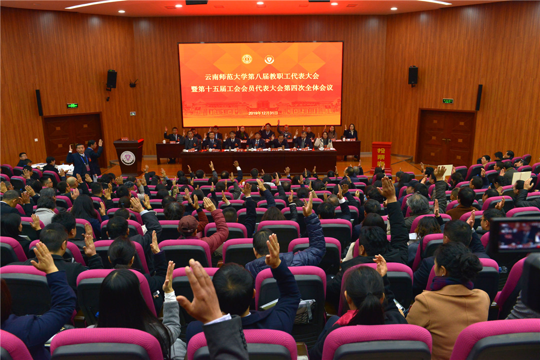校党委饶卫书记作大会总结讲话。饶书记指出,此次大会的召开充分体现了广大教职工“当好主人翁、建功新时代”,积极投身学校改革建设发展事业的良好精神面貌,实现了统一思想、振奋精神、建言献策、深化改革的目标,为学校加快推进教师教育为特色的高水平大学建设营造了良好氛围。饶书记就进一步加强党的政治建设,确保各项改革平稳有序推进和落实提出了四点要求:一是要贯彻新时代党的建设总要求,始终把政治建设摆在首位,推动党的各方面建设全面进步全面过硬;二是要切实提高政治站位,深入学习贯彻党的十九届四中全会、省委十届九次全会精神;三是要加强对学分制改革、岗位聘用制改革工作的领导,确保改革目标实现;四是各级工会、教代会要不忘初心、牢记使命,不断提升履职能力。饶书记号召,全校广大教职工要紧密团结在以习近平同志为核心的党中央周围,始终不忘党的初心、永远牢记党的使命,大力弘扬“跨越发展、争创一流;比学赶超、奋勇争先”精神,在学校党委的领导下,弘扬传统、改革创新、勇于担当,加快推进教师教育为特色的高水平大学建设,不断提升服务云南“三个定位”和打好世界一流“三张牌”的能力,为实现云南教育现代化、全面建成小康社会做出新的更大贡献。FUN乐天使官方网站第八届教职工代表大会暨第十五届工会会员代表大会第四次全体会议在雄壮的《国际歌》声中圆满落下帷幕。