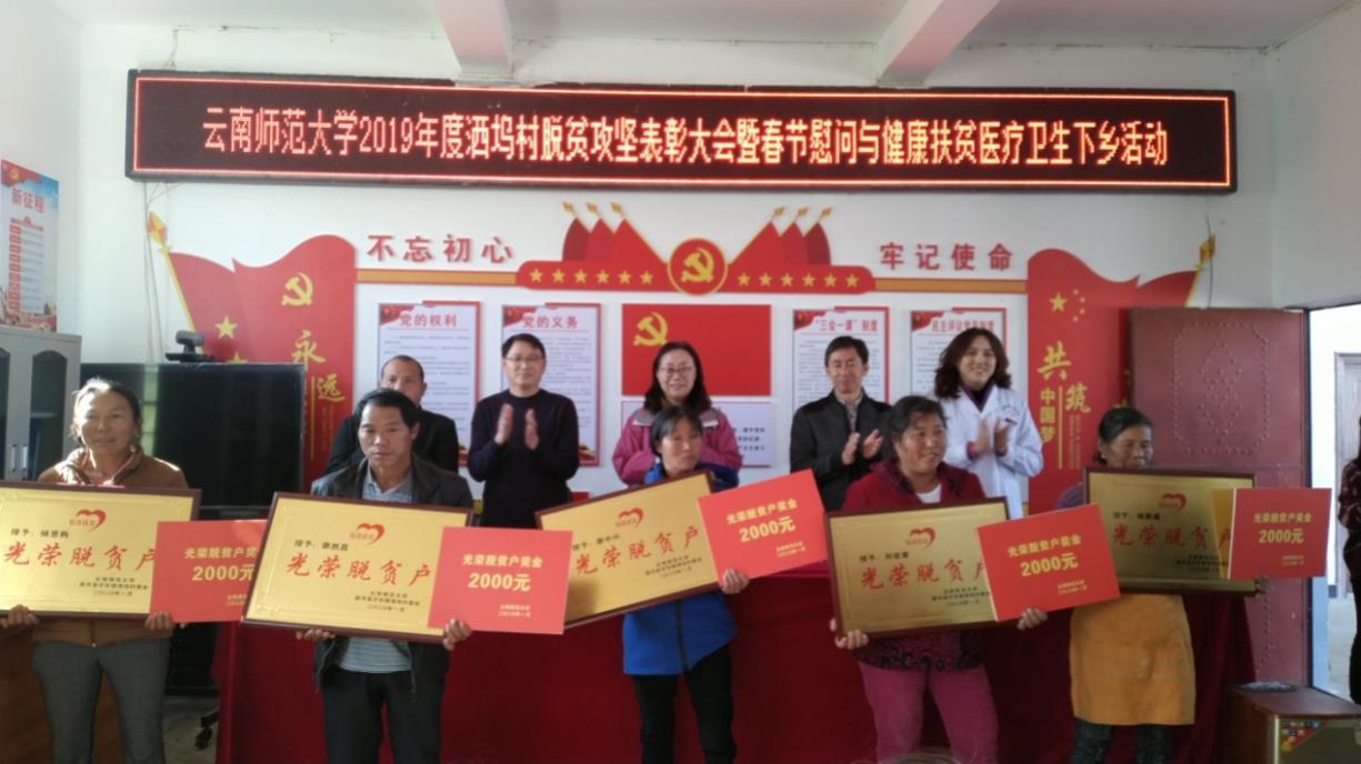 在新春佳节来临之际,为激发广大群众及建档立卡贫困户内生发展动力, 2020年1月6日至 7日,FUN乐天使官方网站分别在挂钩扶贫的梁河县洒坞村和上河东村召开了2019年度脱贫攻坚表彰大会。郝淑美副校长出席会议,对2019年度涌现出的脱贫攻坚优秀脱贫户进行表彰,并对洒坞村和上河东村的建档立卡户进行春节慰问。