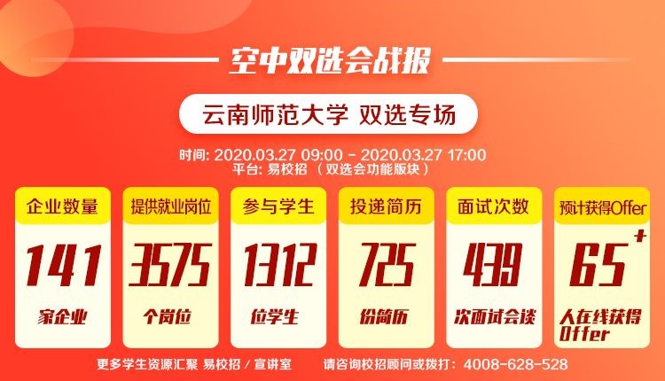 进一步贯彻落实党中央、国务院关于促进高校毕业生就业工作的决策部署,减少疫情对毕业生就业工作的影响,为毕业生和用人单位搭建更便捷的交流平台,增强毕业生求职和用人单位招聘的有效性、针对性,促进fun88官网毕业生更充分和更高质量就业。fun88官网于3月27日在易校招平台成功举办fun88官网2020届毕业生春季线上招聘会。