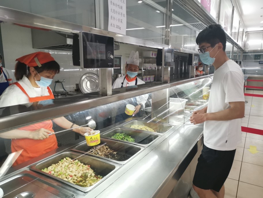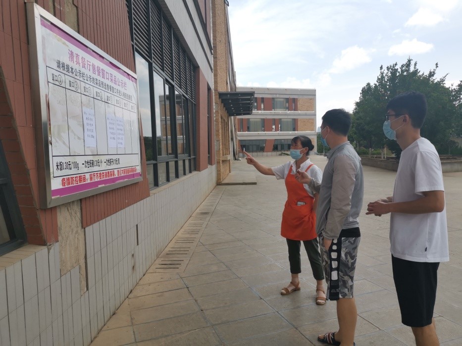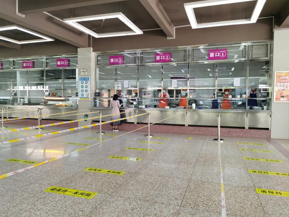 收拾完宿舍,饥肠辘辘的学子们来到久违的食堂。食堂的宣传栏上张贴着各类套餐的价格和对应菜单,餐厅门口摆放着免洗洗手液,地面上粘贴了取餐引导标识和间隔标识,餐厅工作人员井然有序地引导着学生取餐。学生取完餐均打包即走,返回宿舍单独用餐。