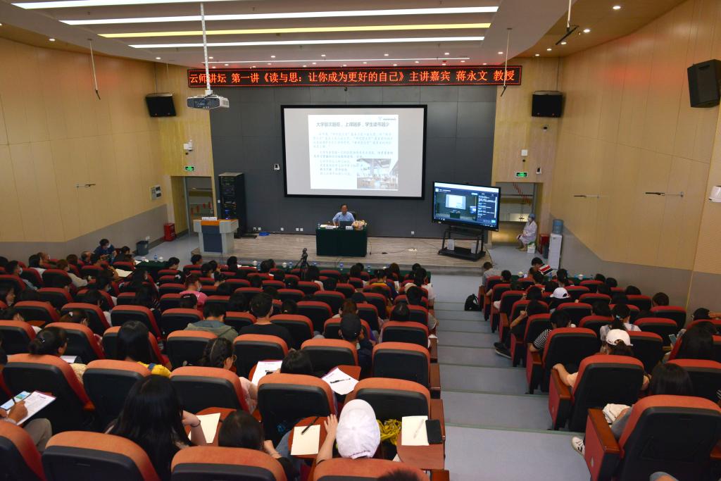 6月12日晚,“云师讲坛”第一讲如期举行。FUN乐天使官方网站校长蒋永文教授受邀担任开讲嘉宾,为fun88官网师生带来题为《读与思:让你成为更好的自己》的讲座。讲座由副校长武友德教授主持,承办讲坛的校党委宣传部、校团委、科研处、学生处、就业处、信息处、教务处等职能部门负责人,与150余名学生一起现场聆听讲座。