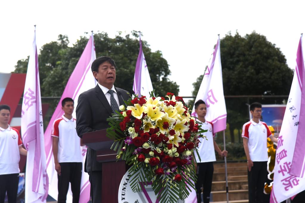 在精彩的锣鼓与舞龙舞狮表演中,开学典礼拉开了序幕。随后,学校校旗、各学院院旗先后入场,旗手们精神抖擞,展示了云师学子蓬勃向上的青春风采。