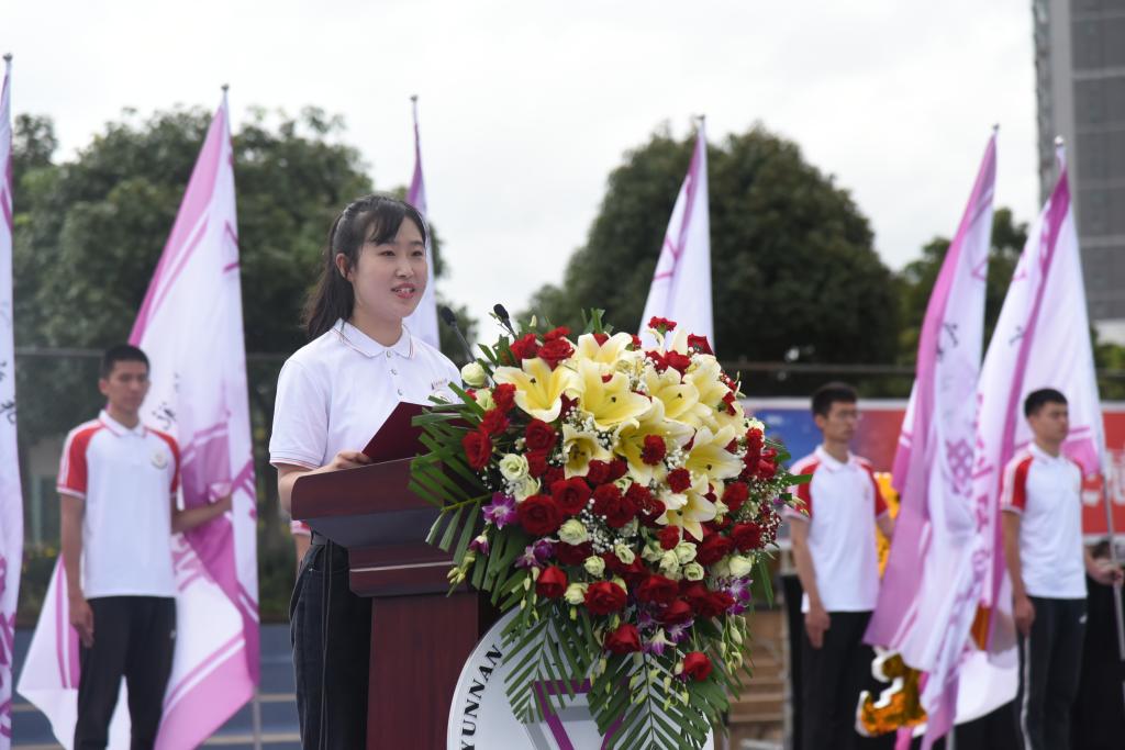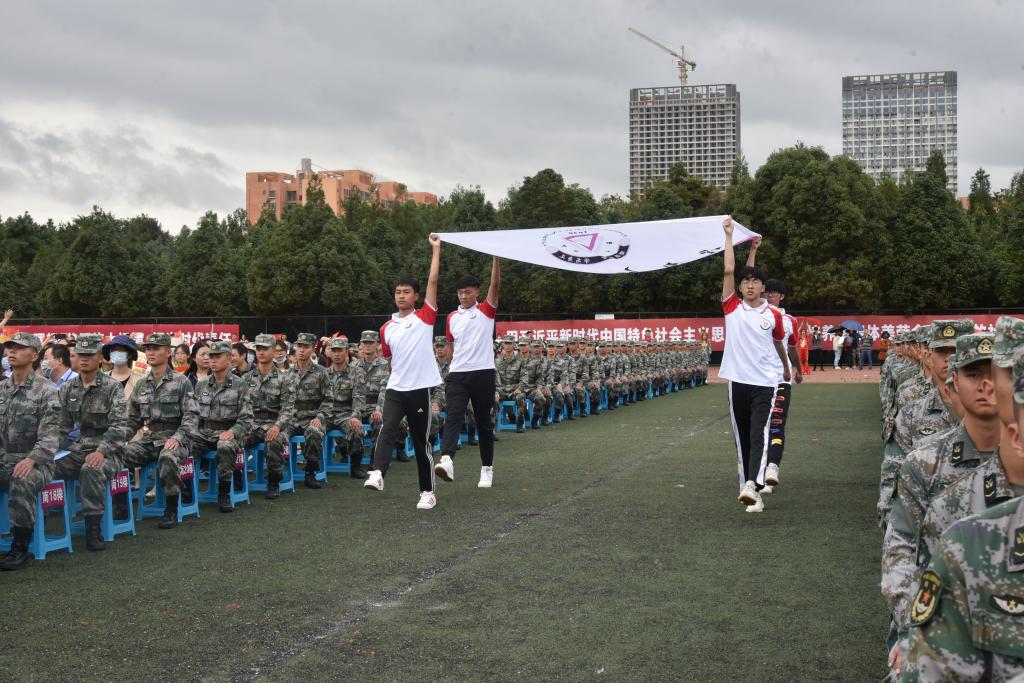 西藏部队退役军人、数学学院2017级张睿贤同学作为在校生代表发言。她饱含深情地分享了大一结束时自己携笔从戎,远赴西藏,在国境线和世界屋脊上保家卫国的参军经历。她希望学弟学妹们面对军训,要克服困难,严格要求自己,学习军人良好的意志和作风,运用在今后的学习生活中,做志存高远、有历史责任感的时代新人。