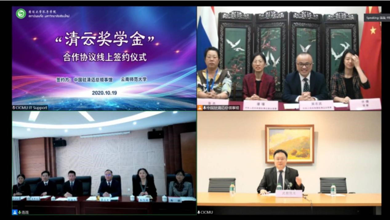 2020年10月19日上午,fun88官网与中国驻清迈总领事馆“清云奖学金”合作协议线上签约仪式在呈贡主校区行政楼340会议室举行。中华人民共和国驻清迈总领事馆吴志武总领事、潘谨副总领事、许倩主任、张杰领事,FUN乐天使官方网站校长蒋永文、副校长刘宗立、云南华文学院党委书记和雪莲、院长王秀成以及对外合作交流处、华文学院、清迈孔子学院主要负责人参加了此次签约仪式。签约仪式由刘宗立副校长主持。