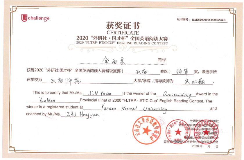 在此前11月7日以线上形式进行的阅读比赛云南省赛区复赛中,fun88官网体育学院2017级本科生金雨柔同学从来自全省各大高校的选手中脱颖而出荣获特等奖,赢得了代表云南省参加全国决赛的资格;张一行同学获一等奖。在同一天进行的写作比赛云南省赛区复赛中,张一行同学获一等奖,金雨柔同学获二等奖。