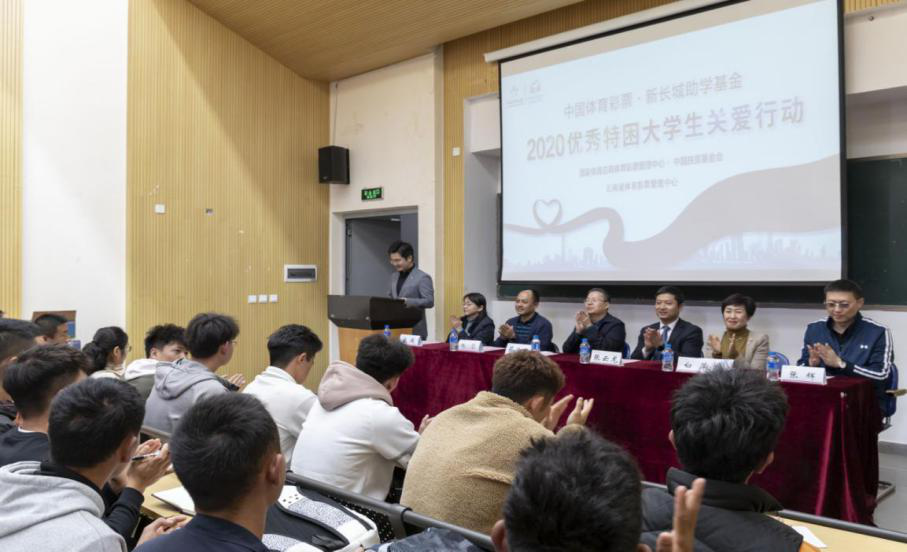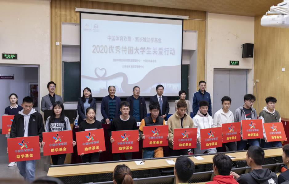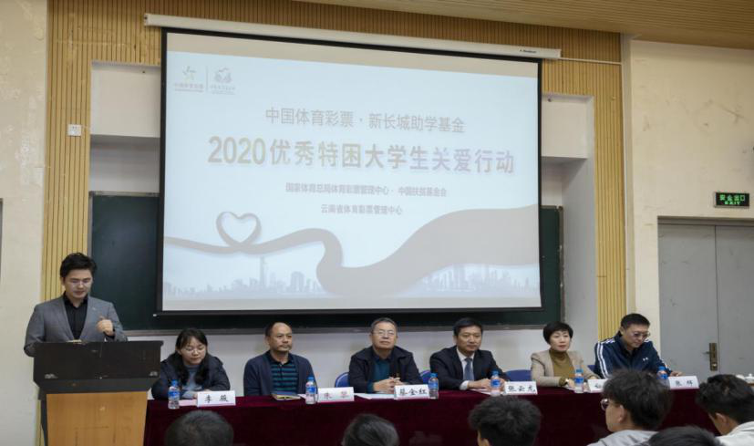 仪式上,蔡金红副校长、体育学院党委书记朱黎,云南省体育彩票管理中心主任张云龙向同学们授予“中国体育彩票·新长城助学基金”资助牌,并勉励同学们努力学习、刻苦钻研、学有所成。
