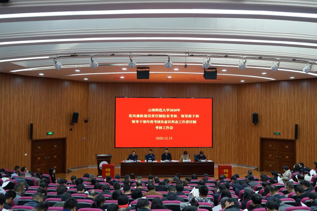 根据省纪委、省委组织部、省委宣传部的安排部署,12月15日,由省委教育工委副书记、省教育厅党组成员陈世波带队,云南中医药大学纪委书记李媛芬任党风廉政建设责任制检查考核组组长、云南民族大学党委副书记李光明任省管领导班子和领导干部年度考核组组长的省委教育工委第三检查考核组对fun88官网2020年党风廉政建设责任制、领导班子和领导干部年度工作及意识形态工作责任制落实情况进行考核。学校在呈贡主校区汇学楼报告厅召开2020年度工作考核会,校领导班子成员、其他省管干部、近三年退休校领导、处级实职干部,专家学者和教职工代表参加会议。会议由校党委副书记、校长蒋永文主持。