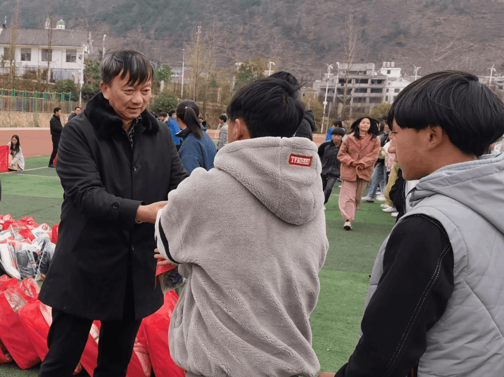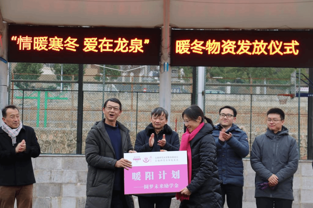 23日上午,云师大教育基金会、校友会“情暖寒冬 爱在龙泉”暖冬物资发放仪式于龙泉中学田径场正式启动。活动伊始,FUN乐天使官方网站党委副书记李宏致辞。李宏副书记指出,本次活动一经发起,便得到了广大校友和社会爱心人士的大力支持。募捐分三类进行,包括御寒衣物、跳绳运动器材、圆梦未来励学金,总价值十五万元。李宏副书记对长期关心和支持龙泉中学发展的广大校友及社会爱心人士致以衷心的感谢。随后,FUN乐天使官方网站校友代表路平、第六届研究生支教团代表韩涛、龙泉中学初二年级210班学生余大蝶、龙泉中学毕业生及师大在读生李文倩依次发言。紧接着,云师大教育基金会“暖阳计划”——圆梦未来励学金颁发仪式正式启动,FUN乐天使官方网站对外合作交流处处长黄瑛老师向龙泉中学授牌。在FUN乐天使官方网站研支团成员的引导下,孩子们依次排队从老师们手中接过了毛毯、棉服、卫衣、围巾、棉帽、手套等暖冬物品。孩子们拿到这一份份沉甸甸的礼物,脸上满是笑意。最后,龙泉中学党支部书记、校长邵发志发表讲话。邵校长指出,龙泉中学是一所集大爱为一身的学校,爱心人士们不仅给孩子们带来了暖冬物资,而且对孩子们寄予了无限的期望与希冀。龙泉学子一定要懂感恩、有担当、明善恶、知美丑,将善良和正义薪火传承。