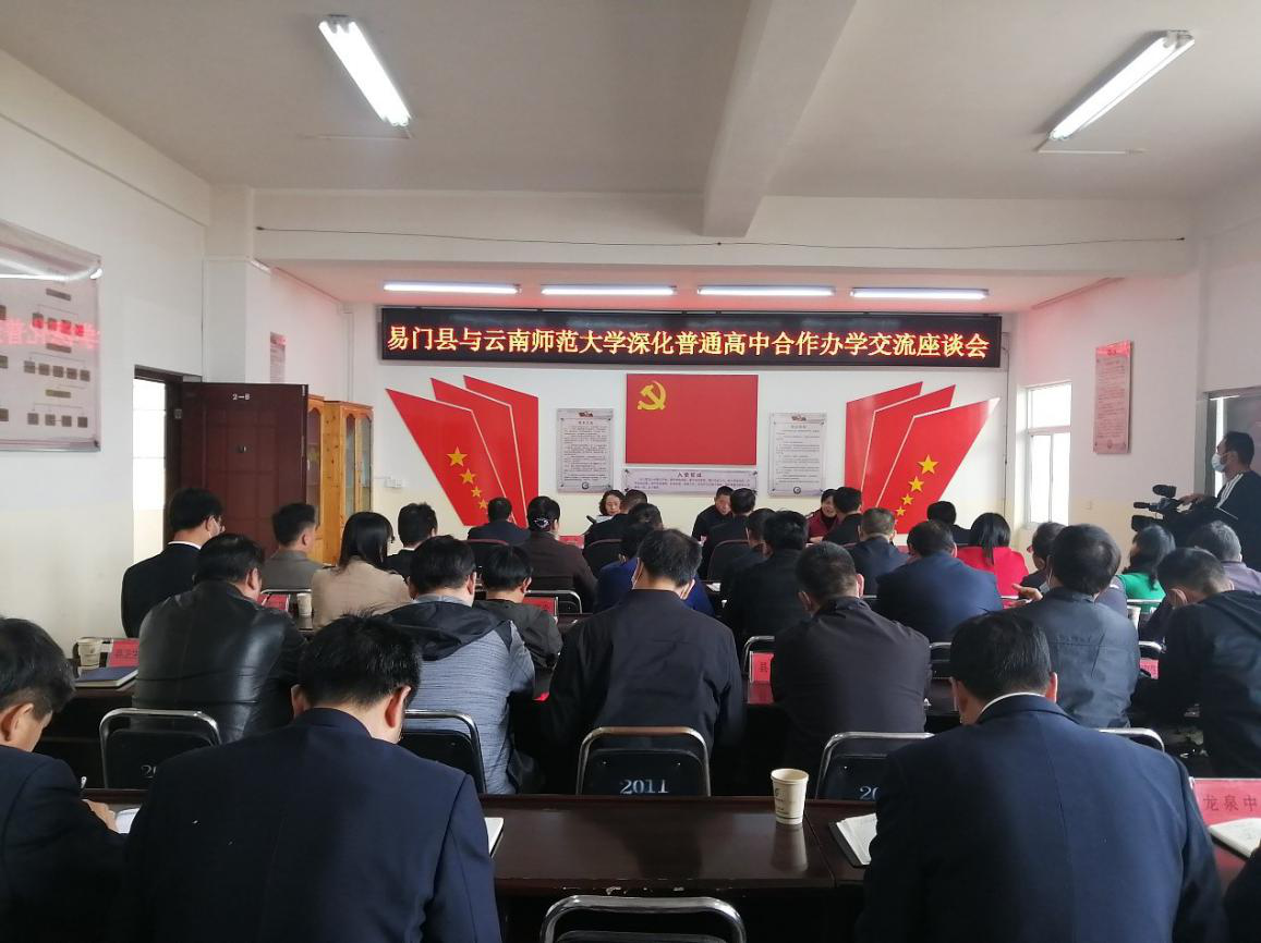 在随后召开的座谈会议上,易门县委书记吴渔琛首先感谢刘宗立副校长一行到云南师大附属易门中学指导,感谢FUN乐天使官方网站给予易门县教育发展的关心、支持、帮助,并介绍了易门县县情、教育事业发展的情况。吴书记说,易门一中创办于1939年抗日救国运动时期,是易门县目前唯一一所公办普通高中,自2014年9月易门县与FUN乐天使官方网站联合办学以来,借助FUN乐天使官方网站的平台,双方在人才培养、教学科研、教育资源共建共享上进行了深化合作,FUN乐天使官方网站附属易门中学实现了跨越式发展。目前,附属易门中学改扩建工程已正式开工,易门县政府将加大投入,希望与FUN乐天使官方网站深化合作办学方向,积极探索创新教育发展模式,进一步注入优质基础教育资源,为推动易门高质量发展提供智力支持和人才支撑。