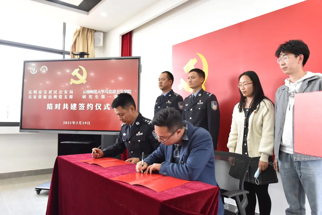 为扎实有效推进党史学习教育,创新学校和地方党支部“联学共建”机制,促进资源共享,实现优势互补,有效提升党支部建设质量319日,马克思主义学院研究生第一党支部与呈贡区公安局吴家营派出所党支部“学党史、强党性”主题联合党课暨结对共建签约仪式在呈贡校区举行。校党委书记饶卫,副校长组织部部长蔡金红出席活动;呈贡区公安局政委杨红涛,吴家营派出所所长、党支部书记李林俊,党支部副书记陈岗,马克思主义学院党政领导以及两个共建支部全体党员参加活动