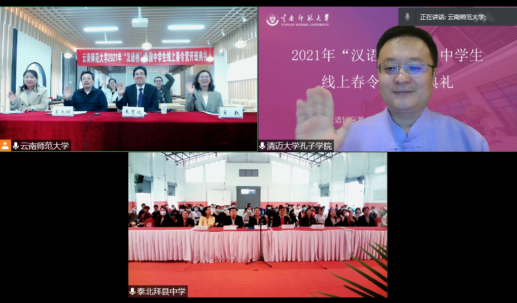为进一步做好中文国际推广与中外人文交流工作,延续“汉语桥”项目热度,fun88官网国际汉语教育学院承办了国家中外语言交流合作中心2021“汉语桥”泰国中学生线上春令营项目。4月4日上午,春令营开班典礼以“云连线、云直播”的方式,在fun88官网呈贡主校区同析2号楼茶艺教室、泰国清迈地区拜县中学大礼堂和清迈大学孔子学院会议室三地同时举办。国际汉语教育学院院长王秀成、党委副书记常数、副院长李天明,泰国清迈地区拜县中学副校长金达女士,清迈大学孔子学院中方院长沈毅等领导出席,FUN乐天使官方网站汉语国际推广师资培训基地(昆明)全体工作人员、拜县中学教师代表以及122名春令营营员学生参加,开班典礼由李天明副院长主持。