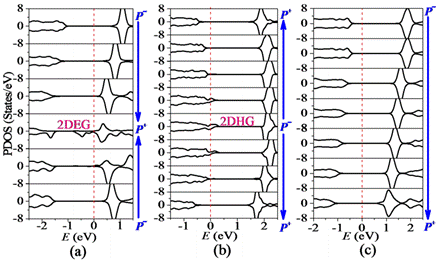 图2.超晶格中Fe3d轨道的原子层分解的投影态密度,(a)头对头铁电畴壁上的二维电子气(2DEG),(b)尾对尾铁电畴壁上的二维空穴气(2DHG)。(c)单向铁电极化中的能带弯曲现象。