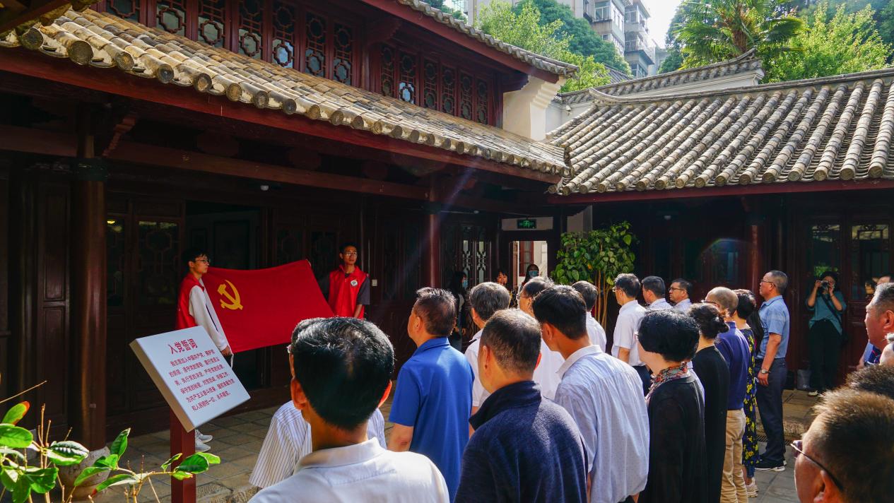 在昆明朱德旧居纪念馆,全体党员面对鲜红的党旗,在校党委书记饶卫的带领下,重温入党誓词。