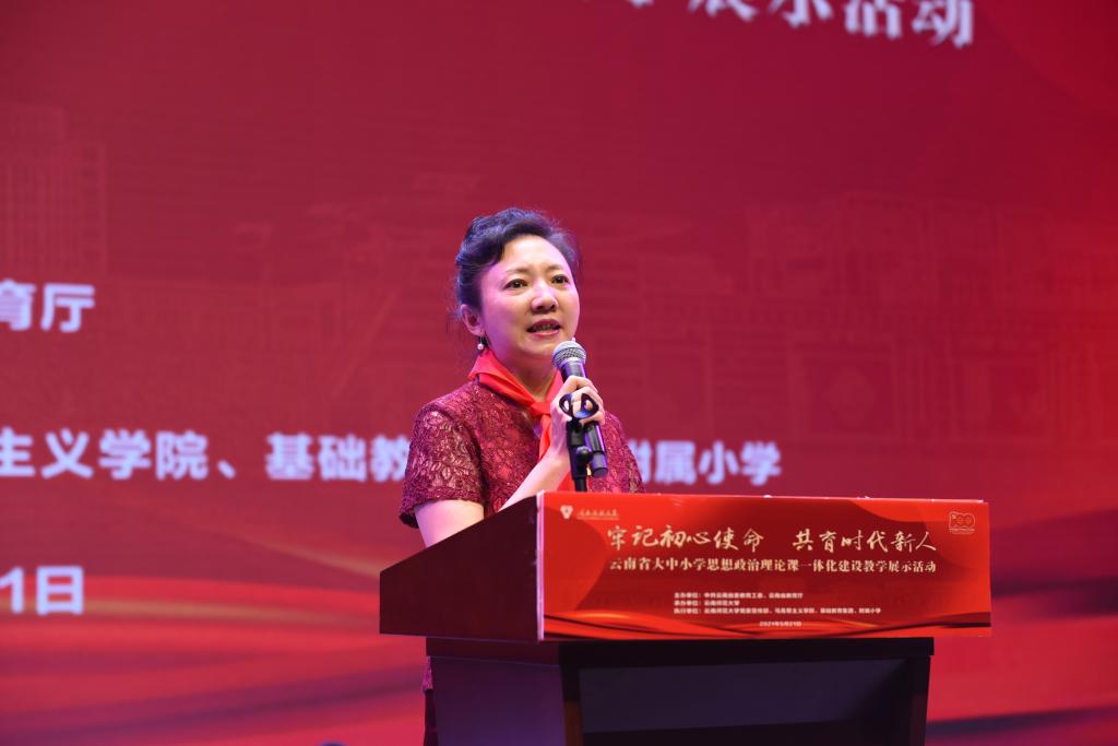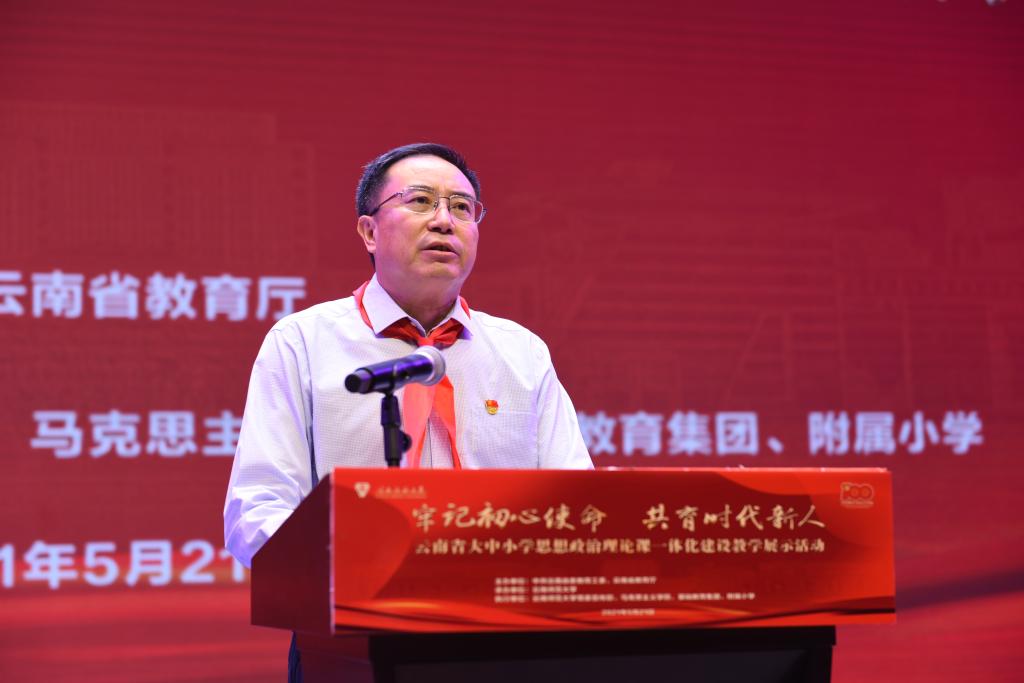 省委教育工委常务副书记杨林代表省委教育工委、省教育厅,对此次教学展示活动的顺利举办表示祝贺,对在思想政治理论课教学和研究中辛勤耕耘、默默奉献的老师们表示崇高的敬意。他指出,近年来,云南省出台深化思政课改革创新13条措施,大力配齐建强思政课教师队伍,积极拓展思政课建设格局,以实施思政课“手拉手”共建计划为重要载体,以集体备课、教学展示为重要途径,推动“大手”拉“小手”,积极探索大中小学思政课一体化建设有效路径。今后,云南省要按照大中小学纵向贯穿、循序渐进和各类课程横向结构合理、功能互补的原则,统筹推进大中小学思政课一体化建设,在“五个一体化”上着力,即教材一体化、教学一体化、教师专业发展一体化、管理一体化、科研一体化。杨林书记表示,思政课改革创新责任重大、意义重大,希望大家共同努力,成功打造云南省思政课改革创新的“升级版”。