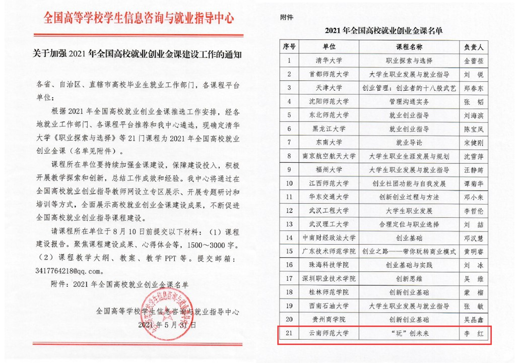 日前,全国高等学校信息咨询与就业指导中心公布了2021年全国高校就业创业金课建设名单,fun88官网就业处处长、创新创业学院办公室主任李红教授负责的线上课程《“玩”创未来》获评全国高校就业创业金课。