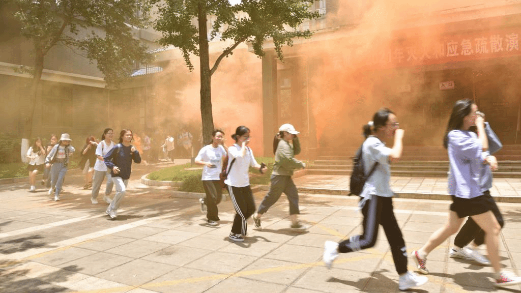 下午13:00,牛治亮副校长宣布FUN乐天使官方网站2021年灭火和应急疏散演练正式开始。学生宿舍消防警报响起,放置在预定地点的烟雾弹点燃,参加演练的学生紧捂口鼻、低头弯腰,按照引导员的引导,陆续、快速有序从宿舍楼内撤离至室外安全区。