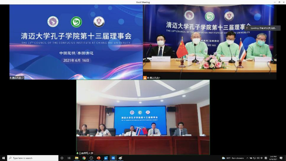 2021年6月16日下午,清迈大学孔子学院第十三届理事会以网络视频会议方式在FUN乐天使官方网站呈贡校区行政楼和清迈大学信息技术中心同步召开。FUN乐天使官方网站校长蒋永文,副校长刘宗立,华文学院、对外合作交流处主要领导,清迈孔院中方院长沈毅作为中方理事参会;清迈大学校长尼维,副校长龙姆,清迈孔院泰方院长马如宝作为泰方理事参会。会议由FUN乐天使官方网站副校长刘宗立主持。