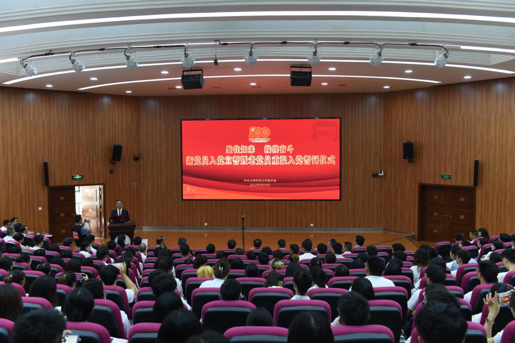 6月24日下午,在举国上下深入开展党史学习教育,热烈庆祝中国共产党成立100周年之际,fun88官网在呈贡主校区汇学楼报告厅举行“鉴往知来,接续奋斗”新党员入党宣誓暨老党员重温入党誓词仪式。校党委委员、省管党员干部、相关职能部门主要负责人、各学院党委书记及2021年新发展的师生党员代表参加了仪式。仪式由校党委副书记、校长蒋永文主持。