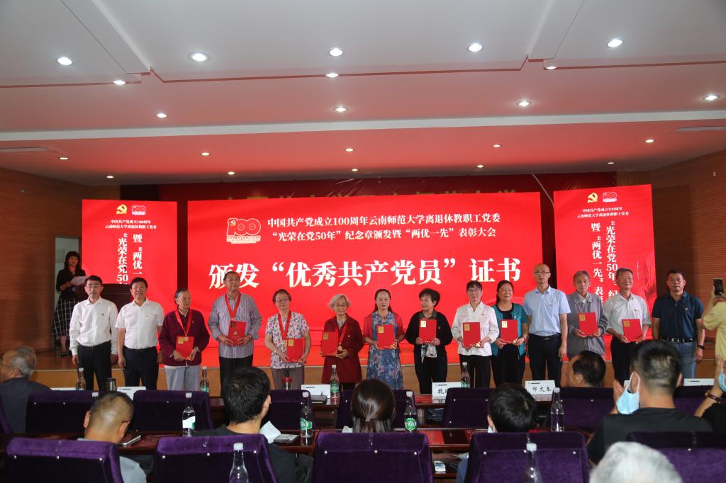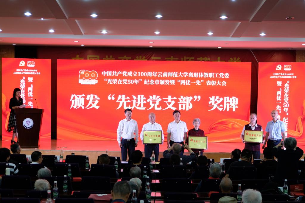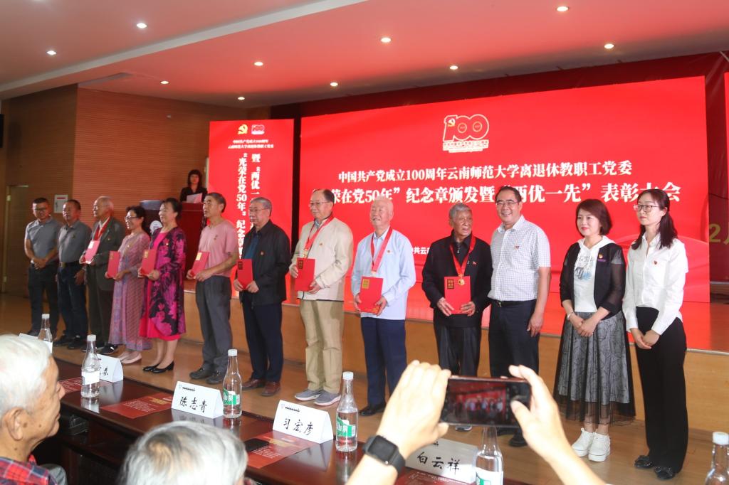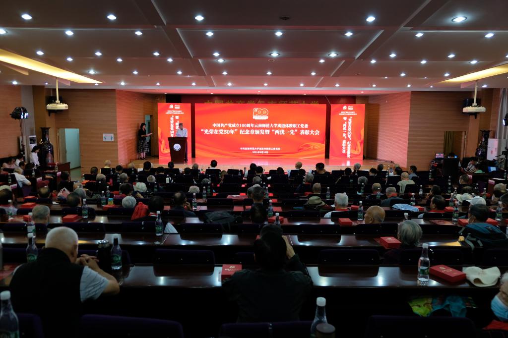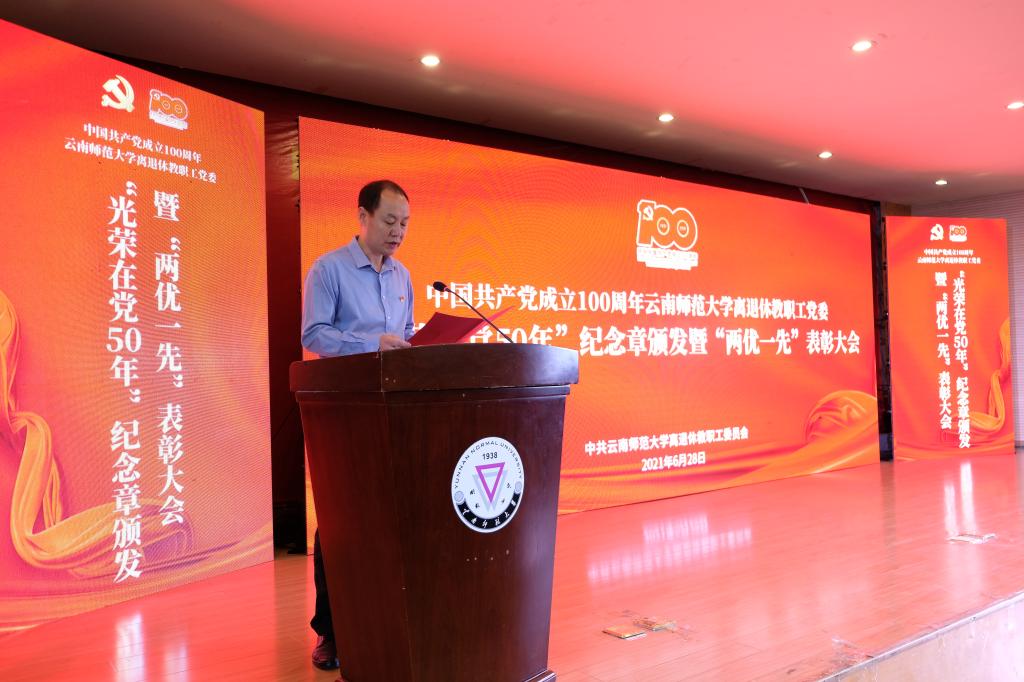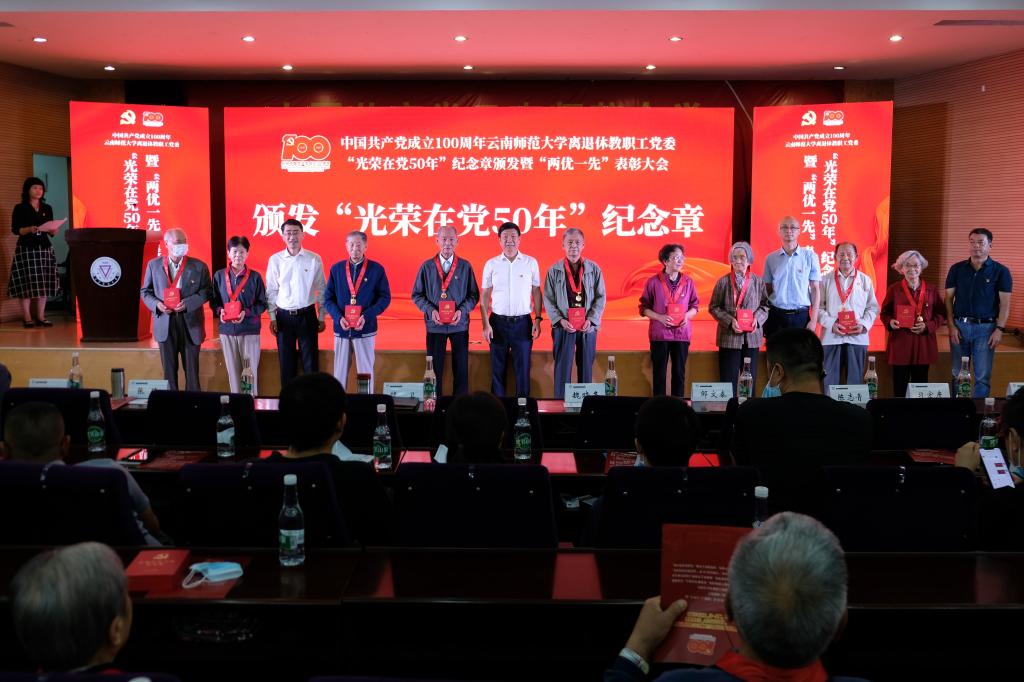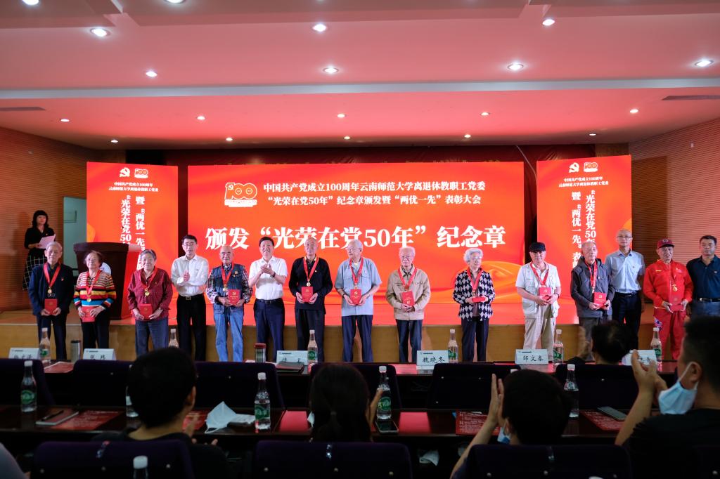 2021年6月28日上午,离退休教职工党委在西南联大校区田家炳教育书院二楼报告厅举行中国共产党成立100周年FUN乐天使官方网站离退休教职工党委“光荣在党50年”纪念章颁发暨“两优一先”表彰大会。校党委书记饶卫、云南省老干部党校校长魏晓冬、校党委副书记张玮,学校离退休老领导,离退休工作领导小组成员单位及联大校区相关单位负责人,获得中共中央“光荣在党50年”纪念章的党员同志,受表彰的优秀共产党员、优秀党务工作者、先进党支部及离退休教职工党员代表等150余人参加会议。表彰大会由离退休教职工党委书记王琼玲同志主持。