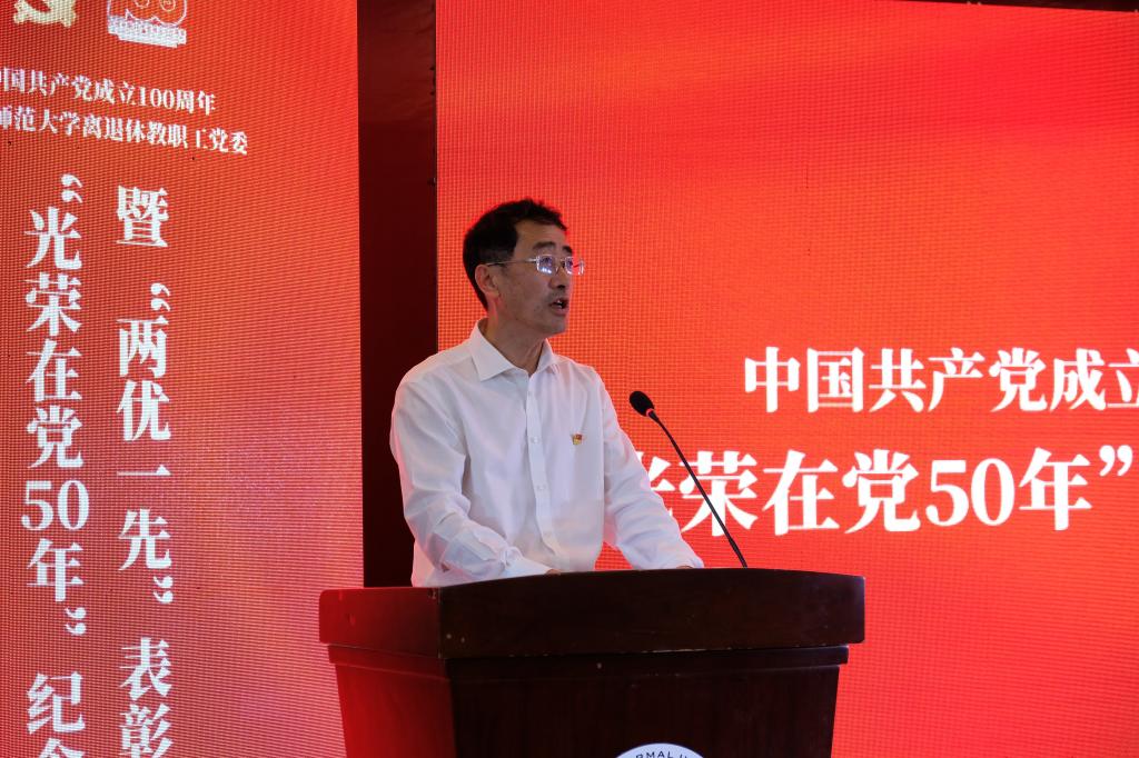 离退休教职工党委委员、离退休工作处处长郭培元同志宣读了获得中共中央“光荣在党50年”纪念章党员名单及校党委、离退休教职工党委表彰的“两优一先”名单。