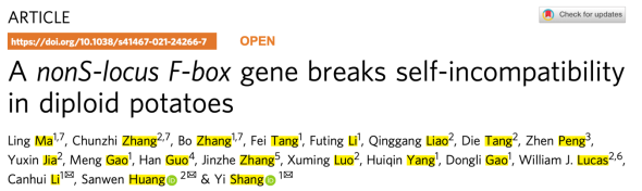 2021年7月6日下午17时,国际知名学术期刊《自然·通讯》(Nature Communications)在线报道fun88官网马铃薯科学研究院尚轶研究团队发表的A non S-locus F-box gene breaks self-incompatibility in diploid potatoes 研究论文,介绍马铃薯自交亲和基因Sli (S-locusinhibitor)的克隆及功能解析。
